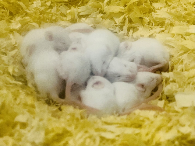 妊娠期間は19 (18~21) 日です 〔Baumans, 2010〕。妊娠した子供の数によりますが、交尾後約15日くらいで、お腹が大きくなってきます。この時期に巣箱の用意をします。あるいは床敷を使って自ら巣穴を作るようになります。妊娠中のマウスには栄養価の高い餌が必要になりますので、餌はヒマワリの種などのカロリーが高いものを加えてあげるとよいでしょう。