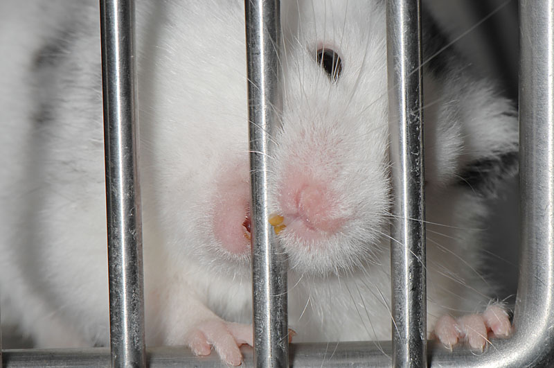 ハムスターはげっ歯目に分類され、上顎と下顎の切歯は発達して大きく、常生歯といって生涯にわたってが伸び続けます。常生歯は物をかじることで歯が削れて、長さを調節します。げっ歯目の学名Rodentiaはラテン語の齧るという意味のrodereからきています。ペットのハムスターにも、前歯を使ってかじる物を与えなければいけません。かじる物として、かじり木としての、かまぼこの板や小枝が薦められていますが、硬いトウモロコシや松ぼっくり(商品として販売されています)などを好む場合もあります。性格にあったものを選んであげて下さい。最も注意したいのは金網ケージをかじることです。金網をかじる癖がつくと、切歯が折れるような事故や不正咬合が起こります。かじることは習性なのでやめさせることはできませんので、代用でかじり木を与えます。