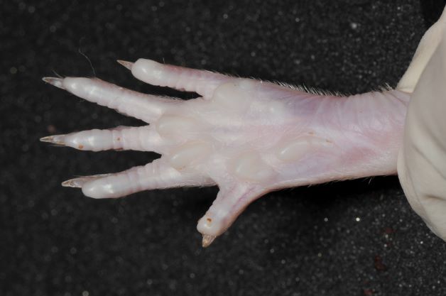 前肢の第1指は退化しているため、前肢は4本、後肢は5本です。