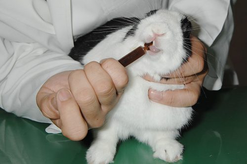 予防程度であれば蛋白分解酵素でも対応できるかもしれませんが、胃のうっ滞や毛球症が怪しい場合は、毛球予防・除去剤の方が効果的です。ペースト状の毛球予防・除去剤でウサギになめさせて、毛球をほぐして糞に出しやすくさせます。自分でなめない場合は、針のついていないシリンジのお尻から入れて、シリンジで与えます。日頃の予防であれば週に1~数回投与ですが、換毛期であれば毎日、治療に使用する時は1日2~3回投与します。一回に与える量はシリンジ2mLの目盛りを基準にしています。