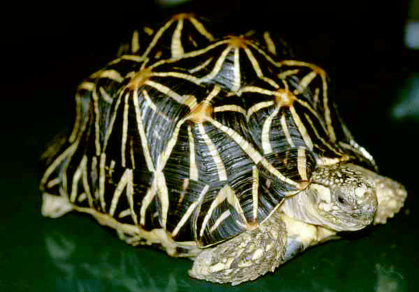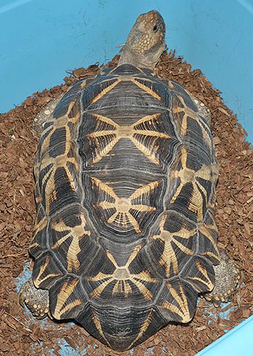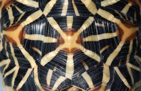 ホシガメは地色が黒褐色で各甲板には黄白色の星形ないし放射型の線が入ります。インドホシガメは1枚の甲板に7~12の線が入りますが、ビルマホシガメは6本の線になります。