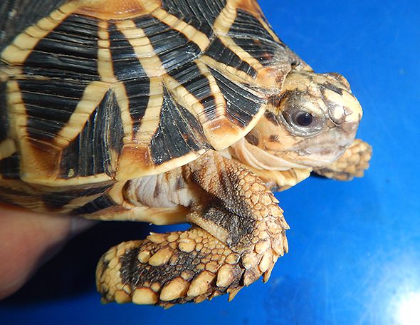 ホシガメは背甲の放射状の模様が星の様に見えることから、和名の「ホシ」、英名の「Star」の由来になっています。ホシガメにはインドホシガメとビルマホシガメがいますが、ペットではインドホシガメの流通量が圧倒的に多いです。ホシガメと聞いてまっさきに浮かぶのはインドホシガメだと思います。インドホシガメは過去に密輸によって大量に流通し、不当に安価に流通していた歴史がありました。幼体はピンポン玉のように丸くて可愛く、また特別に大きくならないことから、ビギナーが衝動買いをし、劣悪な状態で輸送されたためか、状態が悪く早死にさせるケースが多かったです。ビルマホシガメは乱獲のため生息数が少なくなり、2013年から年からワシントン条約附属書Ⅰに掲載され、商業的取引が禁止されました。インドホシガメも2019年11月からサイテスⅠになり、現在は飼育するためには、マイクロチップを入れて届けが必要になりました。両方のホシガメは今や希少なカメになってしまいました。