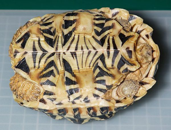 ビルマホシガメは腹甲には条線の模様は入らず、黒とクリームイエローの大きな模様となり、交互に三角形を並べたような模様に見えます。