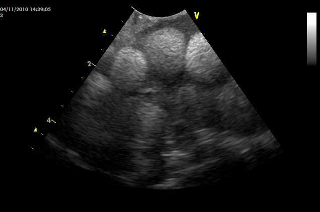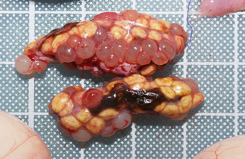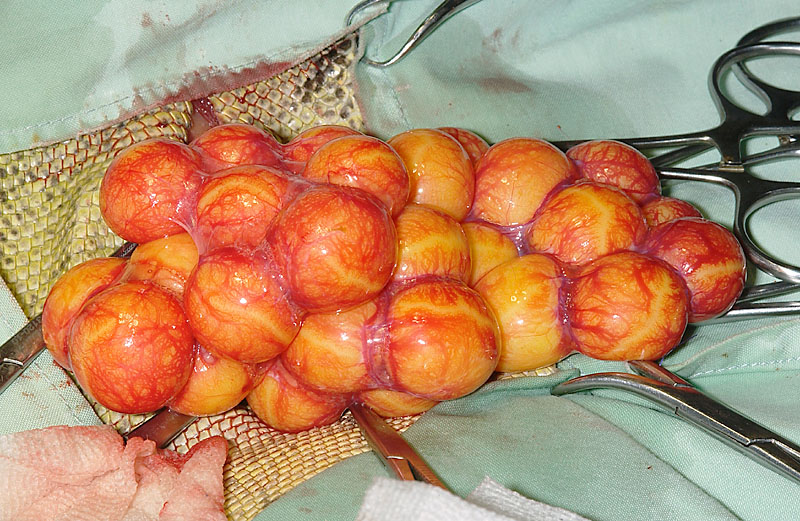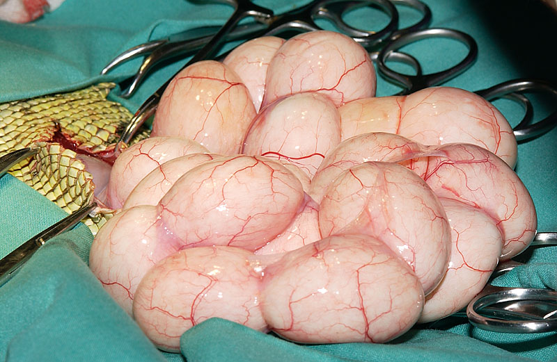 メスが繁殖期を迎えて卵ができたら、一般的に無精卵を産むか、卵が吸収してなくなるかのどちらかです。メスを飼育されている人が、「うちのグリーンイグアナは発情期になっても卵を産まない」という声も聞きますが、よく調べると卵ができて自然に吸収してなくなっていることもありえます。卵ができると2~3カ月の時間を要して無精卵が産み出されます。卵が大きくなるにつれて、拒食、腹部膨満、地面を掘るなどの症状がみられるようになります。卵ができると最初に卵殻がない黄色の卵胞(らんぽう)が形成されます。一つの卵巣に何十個もの卵胞ができるので、まるでブドウの房のようです。卵胞はX線にはうつらないので、超音波検査で診断します。