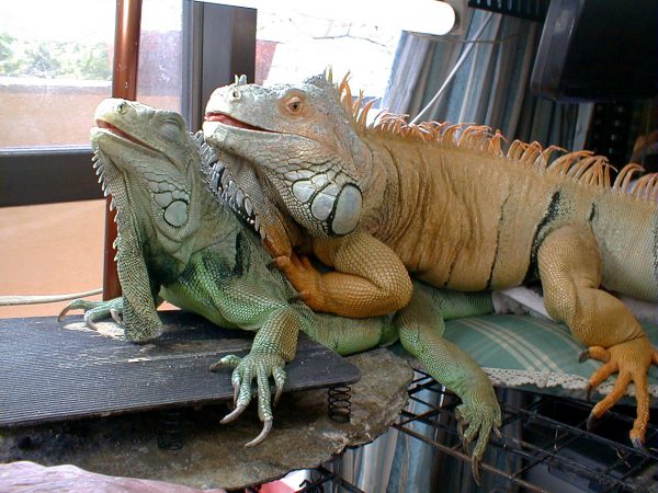 発情したオスは攻撃的になります。体を膨らませ、脚を踏ん張って体を持ち上げてより大きくみせ、相手に対して尾をたたきつけるようなこともします。怒ると口を開け威嚇して、縄張り内に入ってきた何者に対してもかみつくようになります。特にオス同士は激しい喧嘩をするので注意して下さい。発情したイグアナは生理の人間の女性飼育者を攻撃することが報告され、性的誘因の原因とされています。