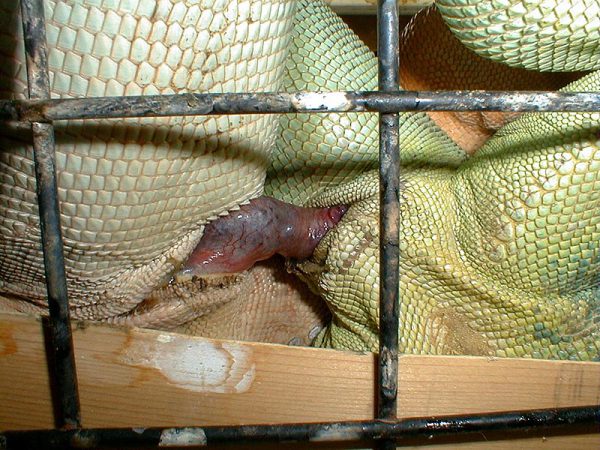交配後約2ヵ月で産卵します〔Rodda 2003〕。卵を持ったメスは腹部膨満になり、消化管が圧迫され、産卵前の4~6週は拒食しますが、それは正常な行動です。産卵までの間は、水分だけは頻繁に摂取するので、新鮮な水だけは用意しておいて下さい。性成熟したメスは交配もせずに、1頭で飼育していても無精卵を産みます。
