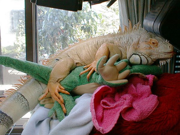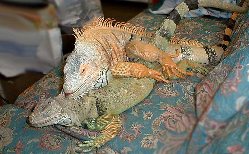 発情したオスの攻撃的な行動は求愛でもあり、メスを求めての性的行動でもあります。この時期のオスは触ることもできず、ましてや離れていても攻撃することもあるため、飼育者はケージの中に閉じ込めたままにするしかないです。オスのイグアナにマスターベーションのために、人の腕を貸したり、性欲処理目的の人形(イグアナフィギュア)をオスの個体の相手にさせたりしています。