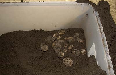 産卵したグリーンイグアをケージに返したら、卵を慎重に掘り返して孵化をさせます。爬虫類の卵は胚が出来るまで(約1日?)は転がっても問題ありませんが、胚が形成された後に転がって上下逆にすると卵が死にます。基本的に卵は見つけた時の向きのまま保管するために、マジックなどで上部に印を付けます。イグアナの卵の孵化には73~80日かかります。温度は29.4℃で、湿度は85%を保つように環境を設けて下さい。孵卵用床敷は、バーミキュライト、ミズゴケ、ピートモスなどが使われます。最近ではハッチライトと言う孵化専用の床材も販売されています。容器は衣装ケースやプラケースなどがよく使われます。乾燥を防ぐために、蓋はしておきますが、代わりにラップなどを使用します。通気性をもたるために、ラップの蓋に針でいくつか穴を空けて下さい。