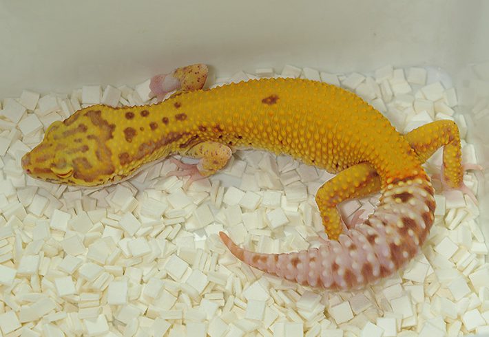 1991年にパット・マーフィー氏が豹紋がほとんどないモルフを作成し(幼体時には少し見られますが、成長とともに消失します) 、マーフィーパターンレス“ と呼ばれています。日本ではリューシスティックとも呼ばれています。リューシスティックとは白化という意味ですが、マフィーパターンレスの地色は真っ白ではなく、薄い黄色が残っています
