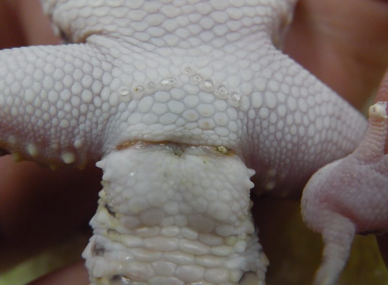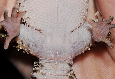 オスはメスよりも大きく、がっしりとしており、メスと比べて頭部の幅があります。オスは総排泄孔の近位に横一列に並ぶ分泌腺の開口した9~14個の前肛孔(ぜんこうこう)が発達しています。
