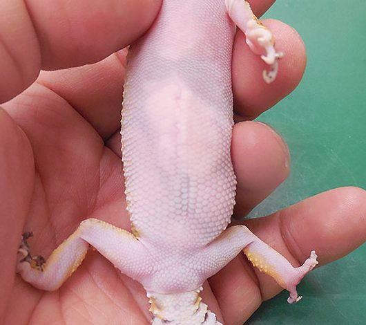 卵が大きくなると、腹面にうっすらと卵が透けて見えてきます。ヒョウモントカゲモは、一度に産む卵は通常2個なので、2つの白い影が特徴です。