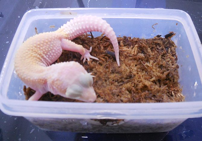出生直後のヒョウモントカゲモドキにはヨークサック(Yolk sac)とよばれる栄養の袋がお腹にぶら下がっています。動き出した幼体のヨークサックを切らないようにし、新たなゲージを用意して移してあげましょう。ヨークサックからの栄養をとるので、すぐには餌を食べません。ヨークサックから栄養を取り終えたトカゲの幼体は初回の脱皮を数日以内にして、初めて自分で口から餌を食べるようになります。