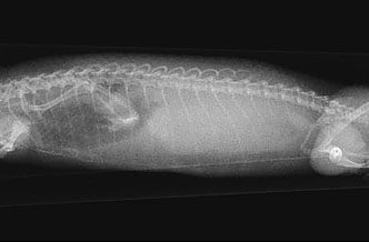 成熟したメスは、オスがいなくても無精卵を産みます。卵胞ならびに卵が大きくなり、拒食することも多いです。これが生理的な妊娠なのか、あるいは卵胞や卵が変性して変性卵胞や変性卵による卵塞が起こることもあります。下のX線写真をよく見ると腹部に楕円の構造物があるのが分かりますか?ヒョウモントカゲの卵は生理的に軟卵なので、X線に卵殻が明確にうつらないのが特徴です。環境が卵を産むのに適していないと、卵胞が排卵して卵になる前に吸収するような現象が起こることがあります(卵胞吸収)。これは生理的現象なので病気ではありません。