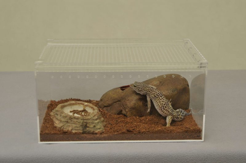 ヒョウモントカゲモドキは地表に住む小型のトカゲで、横幅が30㎝位で、高さの低いローケージで飼育できます。ヒョウモントカゲモドキは立体活動もあまりしませんので、幅が全長の1.5倍くらいの小さいケージでもよいという考えもあります。しかし、レイアウトの幅を広げるには、幅が45㎝位あるとインテリアとして楽しむことができます。高さも極端に背の低いものだと日常のメンテナンスがしづらいので、適度な空間もあった方がよいかもしれません。