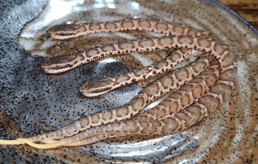 下の写真がマムシの幼体です。毒ヘビのマムシと似た模様をすることで天敵からの補食から逃れているのかもしれません。成長につれて縦縞が現れます。