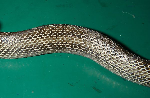 アオダイショウは目の後ろに明瞭な黒い線が横に入る。アオダイショウは目が大きく瞳孔が丸いですが、シロマダラの目は小さく、瞳孔は縦長をしています。アオダイショウの胴体の模様は複雑なはしご状をしていますが、シロマダラは明瞭な黒い横帯が入ります。シロマダラは50~60cm程度の小型のヘビで、夜行性のためあまり見ることはありません。