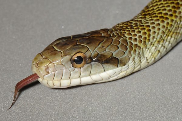 幼体同士や縦縞模様のないシマヘビの成体は見分けにくい場合があります。シマヘビの成体は淡い黄色または茶色をしていおり、そこに明瞭な縦縞が4本入りますが、両種とも縦縞が入らない個体もいるため、最終鑑別は目になります。アオダイショウの目は虹彩がオリーブ色で瞳孔が丸いですが、シマヘビは虹彩が赤く、瞳孔は楕円形をしています。アオダイショウは性格は穏やかでシマヘビはやや気性が荒い印象があります。幼体に関しては、シマヘビは胴体の色合いが赤みがかっていることが多いですが、アオダイショウはオリーブ色から灰褐色をしています。