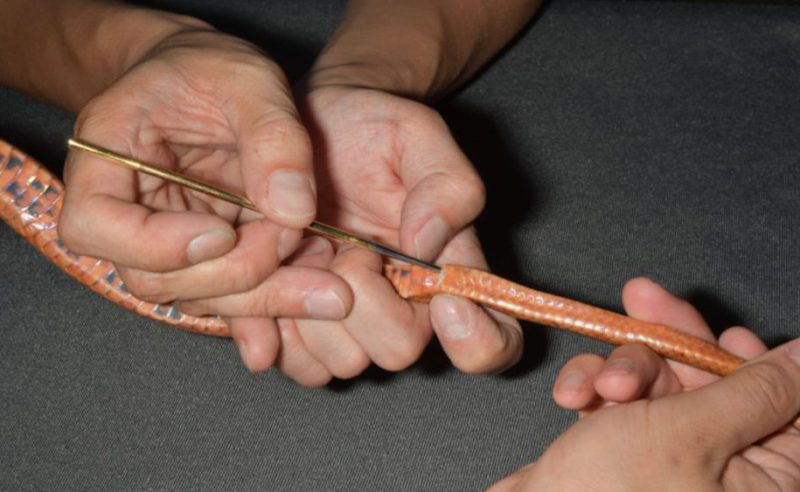 つまり、プロービングはクロアカサックの深さを測っているのですが、明確な数値は分かっていません。一般的にはオスはプローブを抵抗なく深く挿入できますが、メスは総排泄孔から数cmの所でプローブの挿入が止まります。ヘビでは総排泄孔から挿入したプローブの先端が鱗の数で数えると、オスで5~9枚目近くまで、メスで2~3枚目 程度になります。ただし、トカゲやヘビが抵抗してプロー ブを適切に挿入できないこともあり、また挿 入時に力を入れすぎて突き刺してしまうこと もあるため、優しく行うようにします。