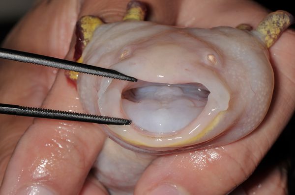 口には明確な歯はありませんが、口腔内の口蓋の上顎中央部に並ぶ歯を持ち(口蓋歯鋤口蓋骨歯列)、逆U字に並んでいます。両生類の有尾類では種類の鑑別に使われます。