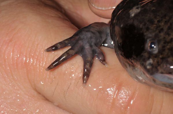 短い四肢には趾があり、前肢の4趾、後肢は5趾です。指は扁平で先端が尖り、わすかな爪を持ち、水かきはあまり発達していません。