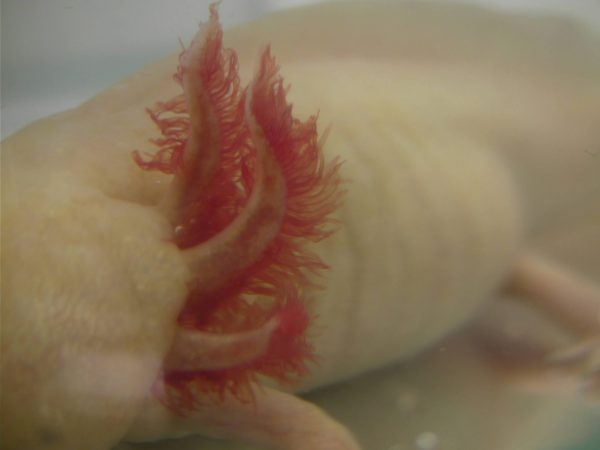 左右に3本ずつ外鰓と呼ばれる鰓を持っています。鰓は水中で生活する動物が、水中の酸素を取りこみ、体内の二酸化炭素を排出して呼吸を行うためのものです。
