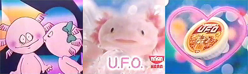 原種は絶滅危惧種としてワシントン条約のITESⅡ掲載種となり、海外への輸出が禁止されています。日本で流通しているものは全て国内でCB個体です。日本では1985年に日清焼そばUFOのコマーシャルにで、宇宙からやってきた「ウーパールーパー(現地語で、愛の使者という意味)」と呼ばれるキャラクターに使われたことがありました。色はアルビノで、ポップなキャラクターソング(ウーパー・ダンシング)とともに大流行し、一世風靡をしました。これがウーパールーパーの始まりで、このブームのためにアホロートルやメキシコサンショウウオとしてではなく、ウーパールーパーという名前が有名になりました。当時のキャラクターが白色であったため、ウーパールーパーは白いのがノーマルという印象が強くなっています(原種は黒系統の斑模様です)。
