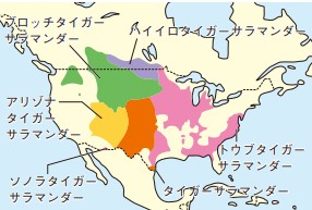 カナダ西部、アメリカ西部、メキシコ北部に分布しています。タイガーサラマンダーはトウブタイガーサラマンダーより明瞭な黄褐色と黒褐色の縞模様が入り、オビタイガーサラマンダー(Barred tiger salamander)とも呼ばれています。しかし、亜種により体色や模様に変異があり、模様を欠くものも見られます。亜種は基亜種であるタイガーサラマンダー(A.m.mavortium)、ハイイロタイガーサラマンダー(A.m.diabolic)、ブロッチタイガーサラマンダー(A.m.melanostictum)、アリゾナタイガーサラマンダー(A.m.nebulosum)、ソノラタイガーサラマンダー(A.m.stebbinsi)が属します。