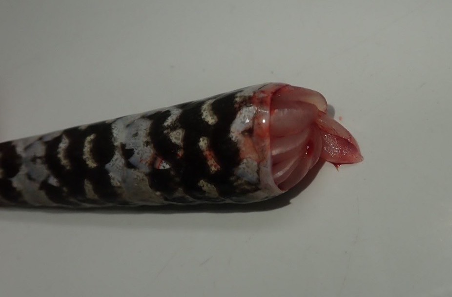 舌はヘビのように二叉になっています。匂いを感知するために、 舌についたにおいの分子を口腔内に一対あるヤコブソン器官へ運びます。 舌先が左右に分かれるのは、同器官が左右にあるためです。