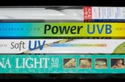 爬虫類用ライトは、UV-Bの強さが「2.0」「5.0」「10.0」のように数字で表記され、光の中でのUV-Bが占める割合を%で表したものです。数値が大きいほど、紫外線が強いと思って下さい。爬虫類の生態を考えると、砂漠と熱帯雨林では紫外線の強さは異なりますので、各爬虫類に生息地に適したライトを選ぶ必要があります。アガマやリクガメなど砂漠やサバンナのような特に紫外線の強い乾燥地帯に住んでいるものは強いものを、昼行性ヤモリや水ガメには中程度のものを、熱帯雨林の森や林床などあまり日の当たらない場所に住んでいるものには弱い紫外線ライトを使用します。ただし、同じ爬虫類であっても、季節や成長期などで通常以上に紫外線が必要なこともありますので、どのライトを使ったらよいのか一定の基準が決められないのです。