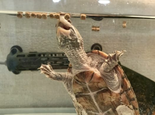雑食性の水ガメでは配合飼料のペレットで長期飼育や繁殖に成功しています。なお、水カメではカメの生態によって、浮上タイプおよび沈下タイプがあり、水の表面に浮いたペレットを採食するか、水中に沈んだペレットを採食するのかで使いわけます。