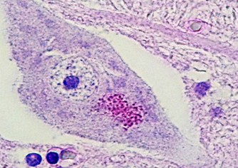 感染したウサギの脳の組織学的な炎症の重症度は、神経症状と反映していません〔Csokai et al.2009〕。Ezの感染により非化膿性(リンパ形質細胞性)から肉芽腫性脳脊髄炎が見られますが、症状は必ずしも発現するとは限りません。そして、抗体価と症状だけでは確定診断にも至らないこともあり、診断ならびに解釈がとても難しいです。ただし、脳幹および小脳局在の病巣は通常、大脳の病巣よりも症状が明確に発現しやすいです。