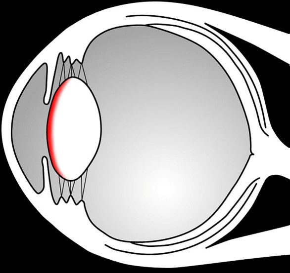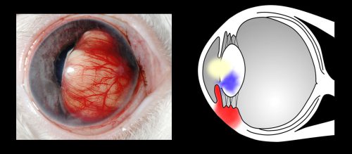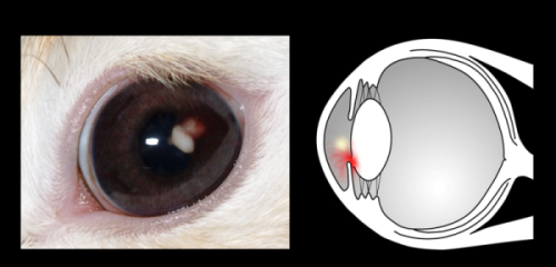 水晶体は白内障になり、白内障起因肉芽腫性ぶどう膜炎を引き起こし〔Wolfe 1993,Stiles et al.1997,Felchle et al.2002,Giordano et al.2005〕、虹彩膿瘍そして前房内に蓄膿します。