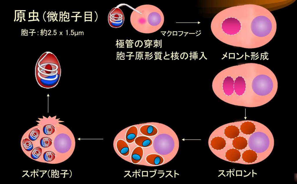 水平感染ルート ウサギでは水平感染が一般的な経路で、小腸(尿で汚染されたエサの摂取)を介して感染します。感染形態は、長期間生存可能で抵抗力のあるスポア(胞子)という状態で起こります。スポアは極管という長い管を伸ばして、スポロプラズムを物宿主細胞へ注入して感染を成立させます〔Didier et al.2000〕。注入されたスポロプラズマは、その増殖型(メロント)に発達して分裂します。メロントはスポロントに分化し、続いてスポロブラストに分化し、スポアの周りに厚い壁が形成されます。細胞質が完全にスポアで埋め尽くされほど増殖し、細胞膜が破れてスポアが周囲に放出し、細網内皮細胞が頻繁に感染して、全身に蔓延します〔Harcourt-Brown et al.2003〕。主な標的部位には、脳、腎臓、肺、肝臓、眼球(水晶体)、および心筋が含まれます〔Kunzel et al.2010,Cox et al.1979〕。スポアは腎臓を介して尿中に排泄されますが、糞便や呼吸器分泌物にも見られることがあります。スポアは尿中に感染後38〜63日に検出され、その後も断続的に排出されます。伝搬経路は尿の経口感染によって腸から寄生されるのが主ですが、他にも経気道、経胎盤感染の報告もあります 〔Scott 2011〕。実験的な感染経路には、外傷性経粘膜感染、静脈内感染、髄腔内感染、および直腸感染もあり得ます。