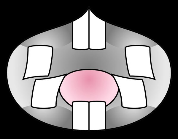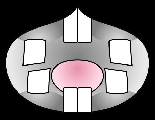 ウサギの臼歯は正面から見ると下のイラストのようにほぼ垂直に生えており、上顎の左右の臼歯は下顎の臼歯よりも幅広く位置しているのが特徴です。