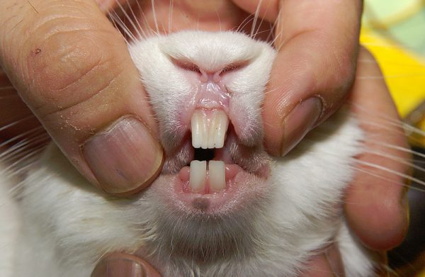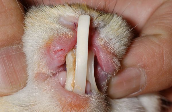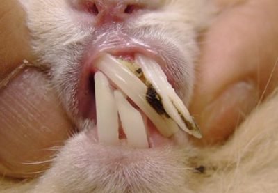 不正咬合では下顎切歯が上顎よりも前方に出ていたり、過長しています。上顎切歯は左右に八の字に広がりながら伸長することもあり、ウルフ・ティース(Wolf teeth:狼の歯)と呼ばれます。下顎切歯が前方につきでるとバック・ティース(Buck teeth:雄の歯)と呼ばれます。伸びた歯が唇にあたって傷つけることもあります。
