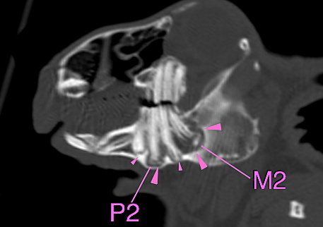 基本的には切歯を肉眼で観察し、口の中に耳鏡などを入れて臼歯を観察します。ただし目視で観察できるのは歯肉から出ている歯冠のみで歯根は見れません。