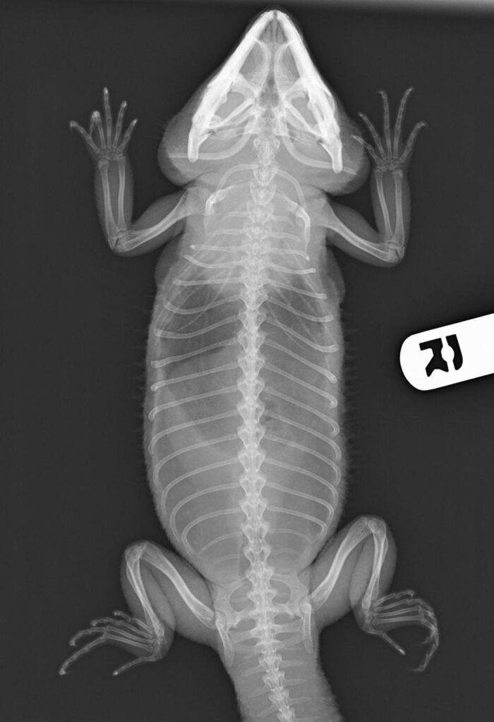 X線での心陰影の評価は、局所組織の重なりと心臓脂肪により、難しい場合があります〔Hynes et al.2019,Kik et al.2005,Mitchell 2009〕。心拡大の評価は現在、明確な基準がありませんが、X線またはCT検査で特定の椎骨(カメ類では甲羅に付着していない最後頸椎、ヘビでは心臓の頭側に位置する第1椎骨、トカゲでは肩甲骨翼の尾側にある第1椎骨)を基準として拡大と評価する方法も推奨されていますが〔Heatley 2020〕、信用性はまだありません。