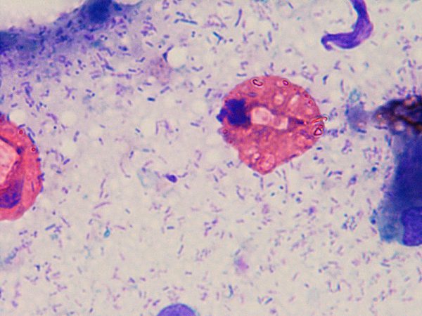 声門からの分泌物の細胞診検査で細菌や炎症細胞などが検出されます。