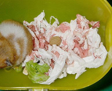 下の写真のように、ハムスターにおいて鮮血が見られる場合はメスの外陰部から出血している可能性が高く、卵巣・子宮の病気が疑われます。また、外陰部からの出血は一時的に止まることもあるので、どこから血が出たのかさらに分からなくなります。おかしいと思ったら、トイレ砂を白色の紙製の商品に変えると、少量の出血でも異常が発見されるかもしれません。