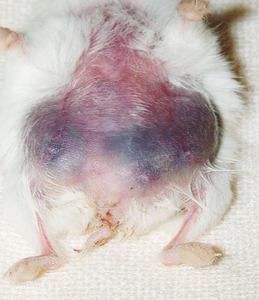 拡大した子宮によってハムスターは腹部膨満が見られます。