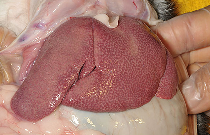 脂肪滴の蓄積により肝臓は著しく腫大(肝腫大)し、黄色く脆弱になる。腫大した肝細胞は肝類洞を圧迫して微小循環を阻害し、肝実質の虚血と壊死を進行させます。機能不全に陥った肝臓は、解毒機能、糖新生、血液凝固因子の合成といった生命維持に不可欠な機能を喪失し、最終的には肝性脳症やDIC(播種性血管内凝固症候群)を併発して死に至ります〔DeCubellis et al.2013〕。