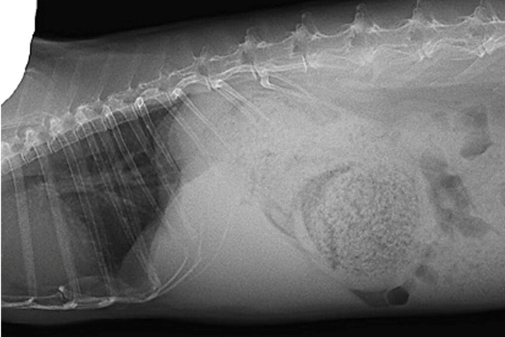 X線検査は、腹部全体の概観を得るための一次スクリーニングとして実施されます。肝臓の内部構造を評価することはできませんが、肝臓のサイズ、形状、位置の変化、および併発疾患(消化管うっ滞、胃拡張、結石など)の有無を評価するために不可欠です。