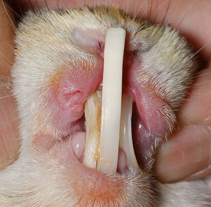 上下の切歯が接触しなくなり、摩耗の機会を失った歯はそれぞれの固有の湾曲に従って過長します。上顎切歯は本来の湾曲に従い、口腔内を後上方へ巻き込むように伸びてきます。重症化すると硬口蓋や頬粘膜を穿刺し、潰瘍や感染を引き起こすこともあります 。下顎切歯は前上方へ向かって突出します。唇を突き抜け、セイウチの牙(Walrus teeth))のような外観を呈し、食物の摂取を物理的に阻害します。出っ歯という意味からBuck teethとも呼ばれています。その結果、硬い牧草を避け、柔らかいペレットや野菜のみを好むような偏食、 餌を口に入れてもすぐに落としてしまう、あるいは拾い上げることができなくなるような採食困難になります。切歯の不正咬合は、単独で終わることは稀です。切歯が過長して口を完全に閉じることができなくなると、臼歯の正常な摩耗が停止します。口が開いたままの状態で咀嚼運動が制限されると、臼歯の歯冠が伸長してきます〔Legendre et al.2002〕。