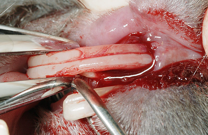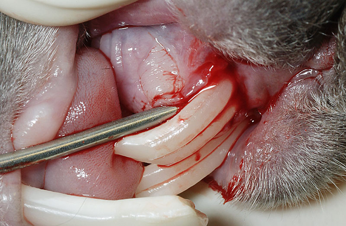 先天性不正咬合に対する長期的かつ根治的な解決策として外科的切歯抜歯術推奨されます。頻繁な通院が困難な場合、あるいは繰り返しのトリミングによるストレスを避けたい場合に限ります。上下計6本の切歯すべてを抜去します 。 全身麻酔下で専用のエレベーター、または 18G/22Gの針を用いて歯周靭帯を円周状に断裂させます。 ウサギの切歯は非常に長く、強固な内側靭帯を持っていますので、歯の曲率に沿って、ゆっくりと一定の力を加えながら回転・挙上させます。抜去後に抜歯窩の底にある歯原細胞を針などで物理的に破壊し、再発を防ぎます。抜歯窩を洗浄し、餌の迷入を防ぐため吸収性糸で縫合して閉鎖します。