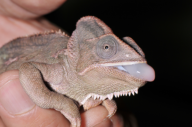 カメレオンを枝から無理に引き剥がしてはいけません。爪や指、あるいは強力な把握力を持つ尾を傷める(骨折や脱臼)恐れがあるためです。尾の先端から順に優しく解き、次に後肢、最後に前肢を外していきます。