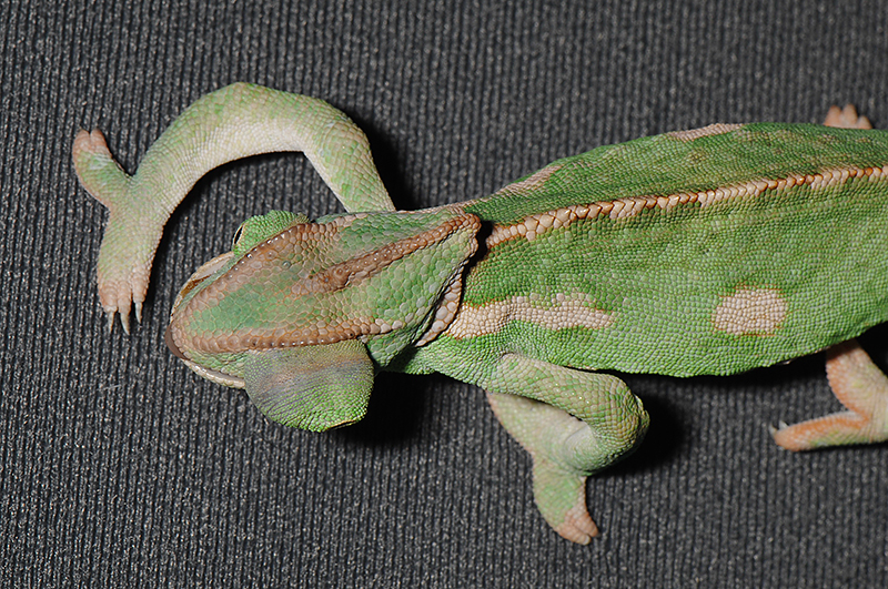 カメレオンはパッチ状に脱皮するが、指先や尾の先端に残った古い皮膚は成長に伴って血流を阻害し、末梢の壊死を引き起こす恐れがあります。