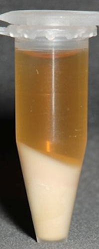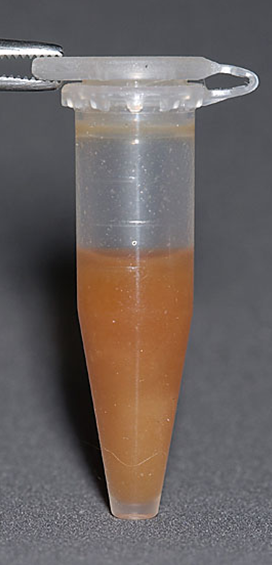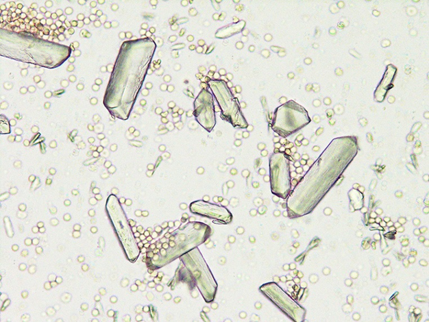 ウサギの尿は沈殿物が非常に多いため、適切な手順で処理を行わないと、重要な細胞成分を見落とす危険性があります。正確な沈査検査のためには、採尿後できるだけ新鮮な状態(30 分以内)で検査を開始することが理想的です。 よく攪拌した尿5mL(検体が少ない場合は1mL程度でも可)を遠心管に移し、1,500~2,000rpmで3~5分間遠心します。過度な回転速度は細胞や円柱を破壊するため注意が必要です。 遠心後、管を反転させて上清を捨てます。ウサギの尿は結晶が多いため沈殿の塊が強固に形成されますが、上清を0.5mLほど残し、再浮遊の溶媒として利用します。沈査を軽く指で叩いて均一に混ぜ、スライドガラスに1滴滴下し、カバーガラスを載せます。ウサギの尿沈査は、炭酸カルシウムの結晶で視野が埋め尽くされることがしばしばあります。