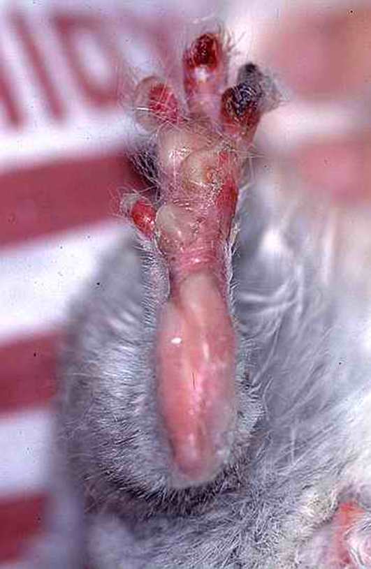 病期における臨床的詳細Grade I ~ II の段階では、チンチラは顕著な跛行を見せないことが多く、飼い主が異常に気付くのは困難です。この段階では、足裏を確認すると特定の加重部位(特にかかと側の中足骨隆起部)がピンク色から鮮紅色に変色しているのが観察されます。適切な環境改善介入を行えば、この段階での回復は十分に可能です。