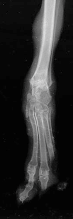 Grade IV 以上では、足部全体が大きく腫れ上がり、排膿が見られる他、触診に対して激しい痛み反応を示します。この段階では、もはや不可逆的な変化が生じており、正常な歩行機能への回復予後は慎重から不良となります。
