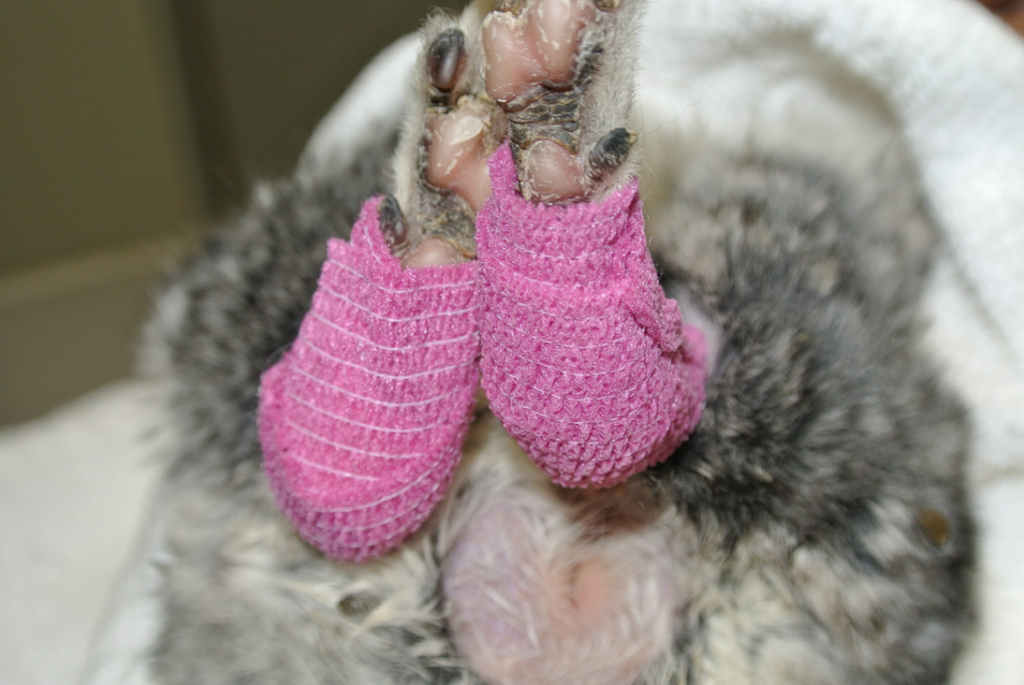 Grade III に進展すると、疼痛が顕在化し、チンチラの活動性は著しく低下します。潰瘍部は肉芽が見えることもあれば、暗褐色の厚い痂皮に覆われていることもあります。この痂皮を不用意に剥がすと激しい出血を伴うため、注意が必要です。